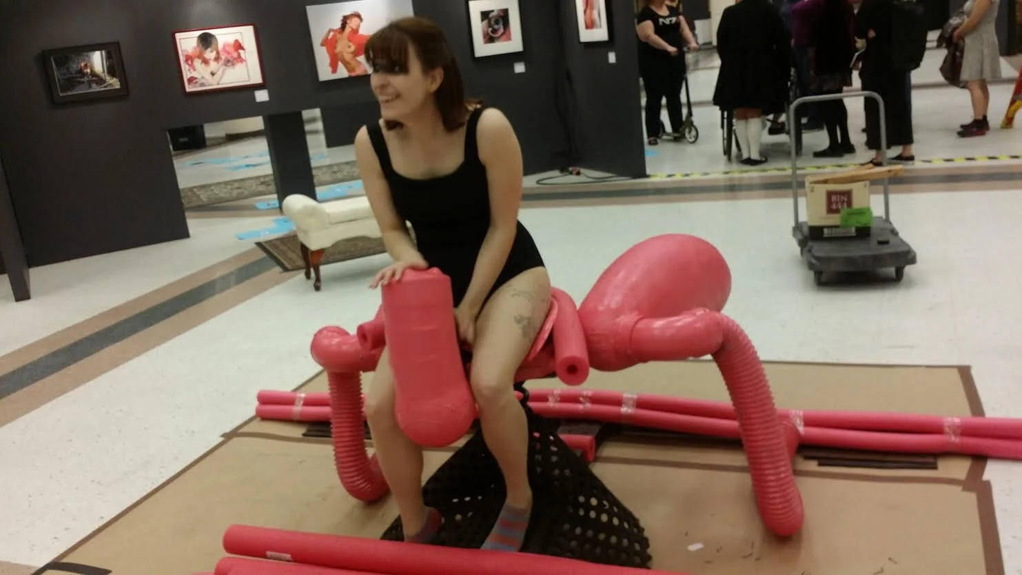 The sculpture features a seat approximately 3 feet high, with 4-foot resin-coated Styrofoam elements that replicate a clitoral form. When in motion, it activates accelerometer-triggered light displays and sound effects, creating a dynamic sensory experience. For added stability, Rock the Clit is securely mounted on six-foot steel beams. Currently in storage, it’s available for exhibition or event rental, offering a unique and engaging experience for adventurous participants.