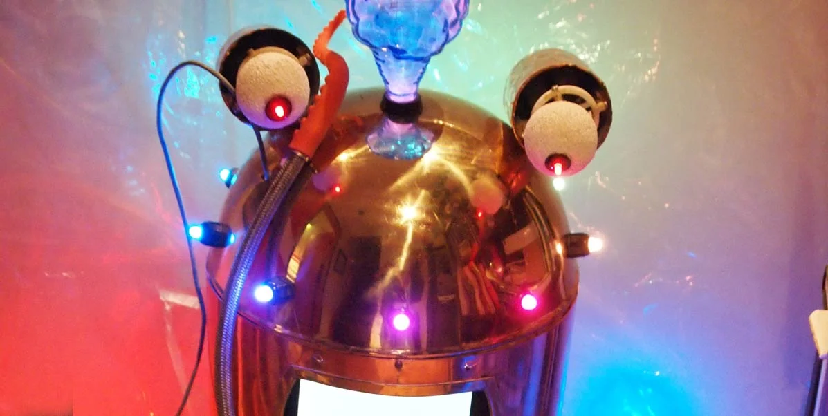 ‘Rupert the Chatty Robot’ is a small, cylindrical brass robot that bears a striking resemblance to a blend of R2D2 and a sleek Italian espresso machine—though he doesn’t make coffee!